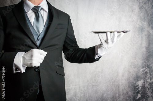 Portrait of Butler or Waiter in Dark Suit and White Gloves Holding Silver Serving Tray. Copy Space for Elegant Hospitality and Fine Dining.