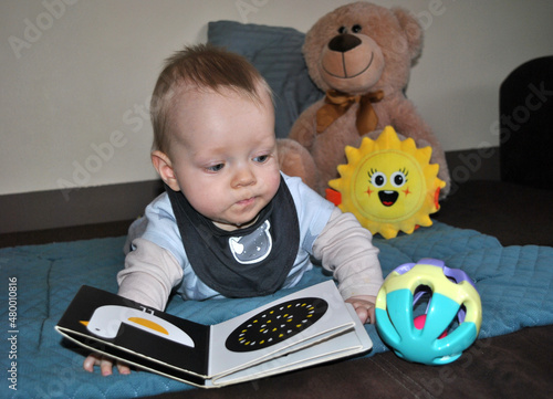 Zdjęcie przedstawiające leżące małe dziecko oglądające książeczkę kontrastową