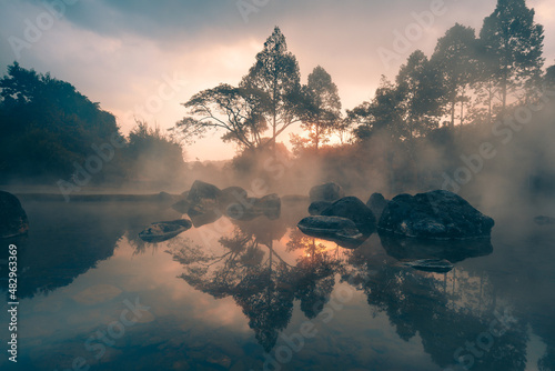 Beautiful sunrise at Chae Son Hot Springs over the misty morning is a famous place and destination at Lampang, Thailand.