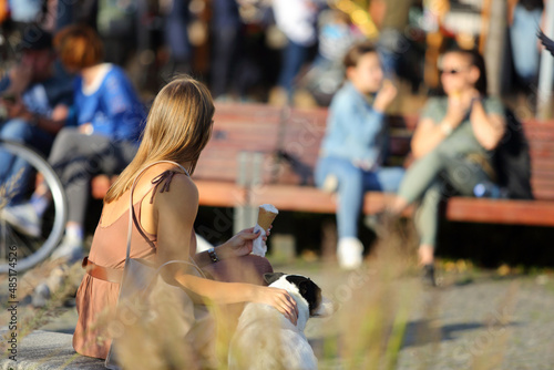 Młoda kobieta siedzi na ławce z lodem i psem.