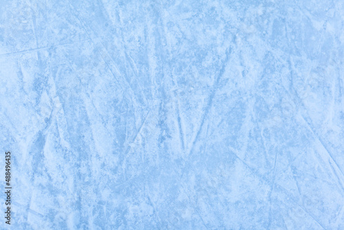 Empty ice rink with skate marks after the session outdoor. skating ice rink texture covered with snow in daylight. Close up of blue ice rink floor, copy space