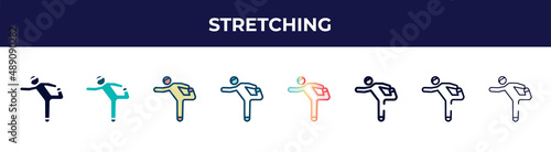 stretching icon in 8 styles. line, filled, glyph, thin outline, colorful, stroke and gradient styles, stretching vector sign. symbol, logo illustration. different style icons set.