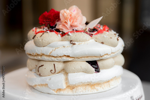 beza, torcik, jedzenie, deser, biała, słodki, przepyszny, ciastka, delikatesowy, swiezy, krem, kwiat, goździk