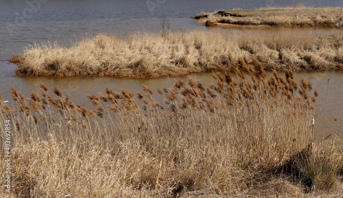 Dolina Odry - rzeka, krajobraz rzeczny - widać trzciny i cyple porośnięte trawą - woda szaroniebieska -trawy brązowe i jasnobeżowe