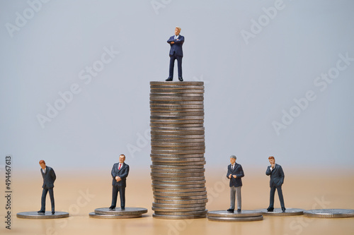 Miniature figure of five businessmen standing to different high and low coins stacking for position and successful business investment income concept.