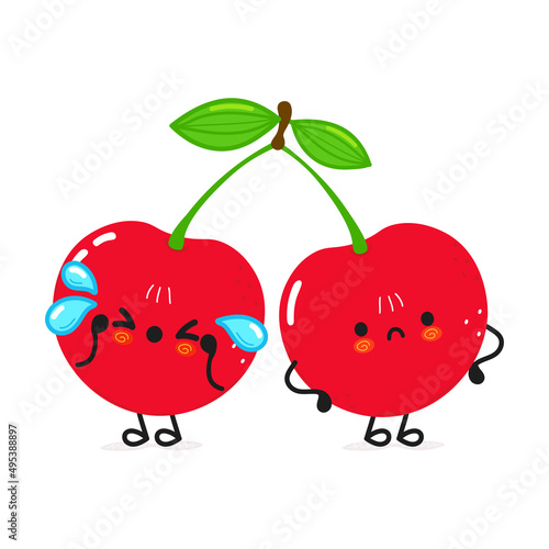 Cute sad cherry character. Vector hand drawn cartoon kawaii character illustration icon. Isolated on white background. Sad cherry character concept