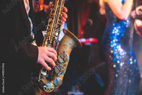 Concert view of a saxophonist, saxophone sax player with vocalist and musical during jazz orchestra performing music on stage
