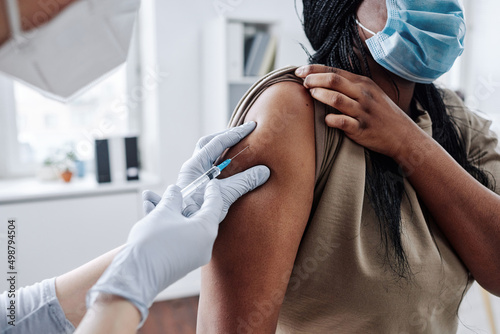 African young woman in mask visiting doctor at hospital to get vaccine from coronavirus
