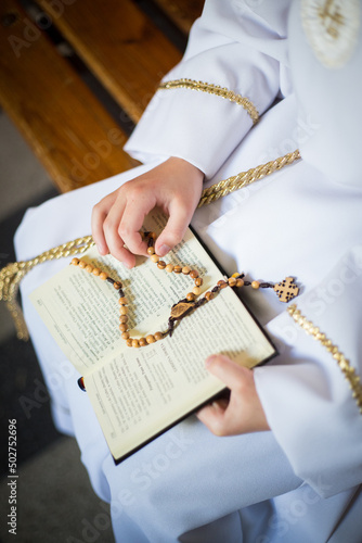 Dziecko przystępujące do sakramentu Pierwszej Komunii Świętej trzyma w ręku różaniec i modlitewnik