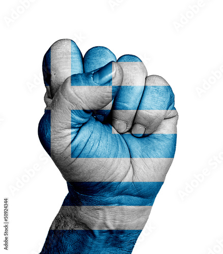Low key picture of a fist painted in colors of greece flag