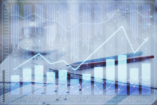 Forex graph hologram on table with computer background. Double exposure. Concept of financial markets.