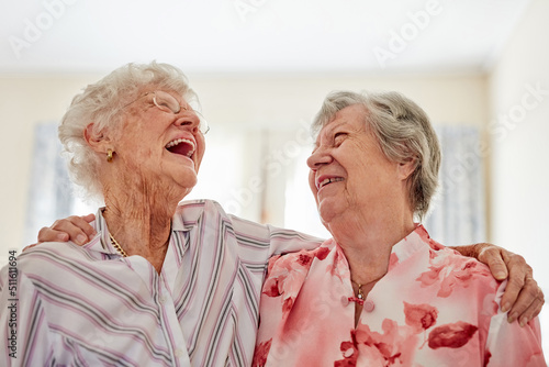 One of lifes greatest pleasures, a good old friend. Shot of two happy elderly women embracing each other at home.