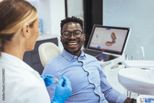 Smiling african guy in dentist chair looking with trust at his doctor, close up. Young African American Man Getting Teeth Treatment With Professional Stomatologist At Modern Clinic, Closeup