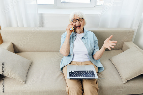 a joyful woman is sitting relaxed on a cozy sofa talking on a smartphone, holding a laptop on her lap while working from home, and gesticulating with her hand