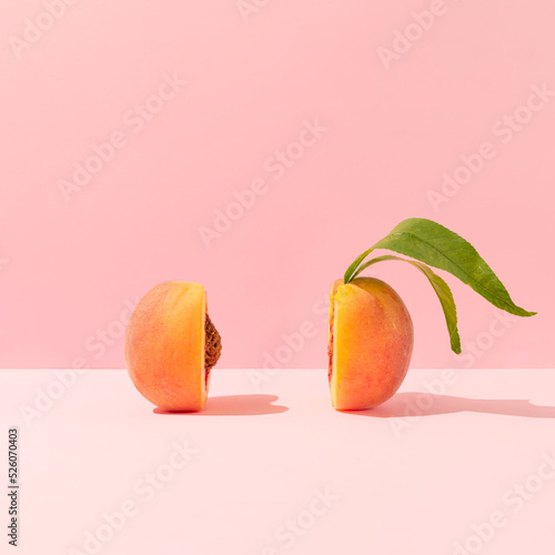 Fresh ripe organic peach with pit and leaves cut in half against bright peach pink background. Minimal fruit concept. Healthy juicy food trendy composition.