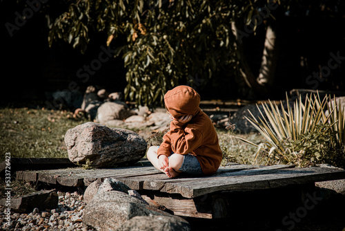 Smutny chłopiec, smutne dziecko w żałobie, wspomina, samotny, zamyślony, zapatrzony, na drewnianym pomoście jesienią