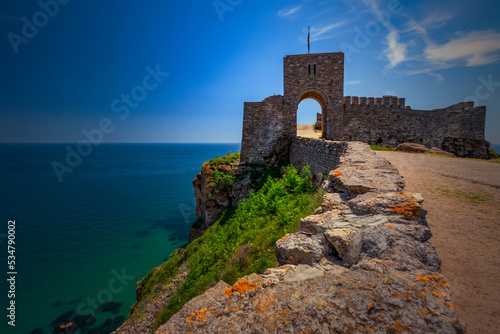 Krajobraz morski z niebieskim niebem i białymi chmurami. Piękny przylądek Kaliakra w Bułgarii.
