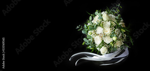 bukiet ślubny z białych kwiatów na czarnym tle jako baner, bouquet wedding