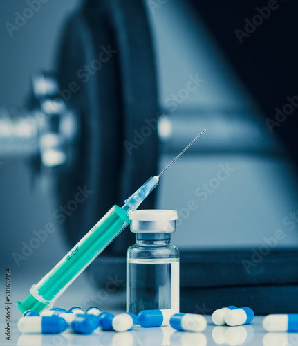 dumbbells, syringe with needle, pills and vial with steroids. illegal doping in sport concept