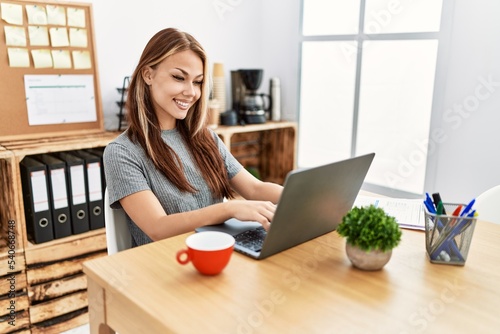 Young brunette woman working at the office with laptop with a happy and cool smile on face. lucky person.