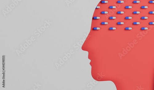 Mental health prescription drugs. Head with drug capsule. Antidepressant medication. 3D Rendering