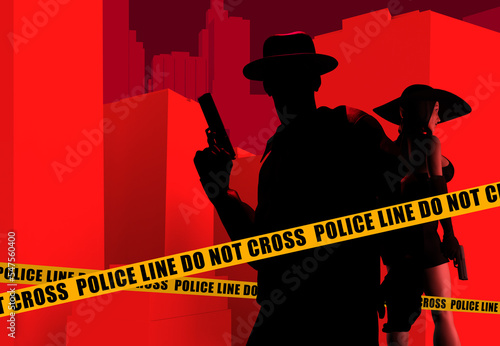 3d render noir crime illustration of armed detective silhouette in hat and jacket with sexy spy lady in dress with gun on red colored cityscape background with yellow police lines.