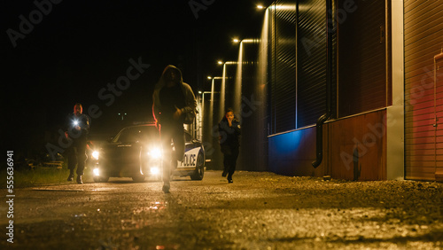 Two Police Officers in Pursuit of a Suspect. Cops Getting out of the Car Start Chasing Criminal on Foot Through the Dark City Streets. Heroic Officers Catching and Arresting Drug Dealer, Murdered