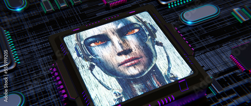 Ein Chat Bot. Cyborg Gesicht auf einem Computerchip - chatGPT - Technologie der Zukunft - Ki Technologie, intelligenter Roboter Ai Chat GPT Anwendungssoftware