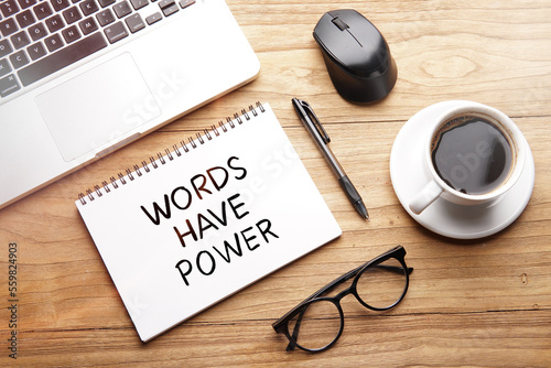 Words Have Power, motivational words and sentences for work and life. Quote sentence in notebook with laptop, pen, coffee over wooden background.