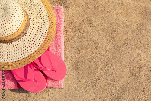 Beach towel with slippers and straw hat on sand, top view. Space for text