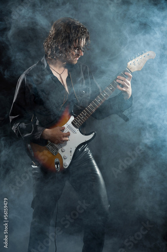 Psychedelic rock guitarist with long brown hair and beard. Dress