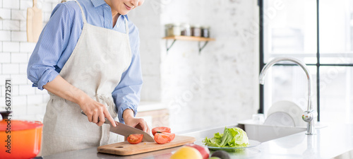 食事の支度、明るく広いキッチンで野菜を切る