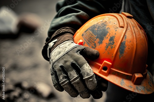 Arbeiterhelm auf dem Bau. Sicherheitshelm auf der Baustelle - sicher Arbeiten mit Heln und Handschuhe - KI generiert