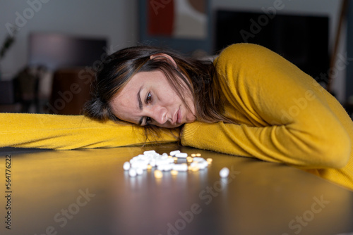 Adult melancholic female with long dark hair in yellow sweater leaning head on hand at table with pile of antidepressant pills at home