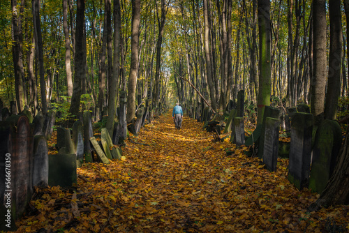 Old tombs in Jewish cementary in Warsaw, Poland in autumn foliage.