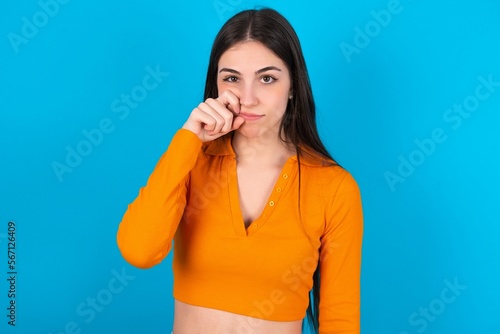 Disappointed dejected young caucasian brunette girl wearing orange crop top against blue wall wipes tears stands stressed with gloomy expression. Negative emotion