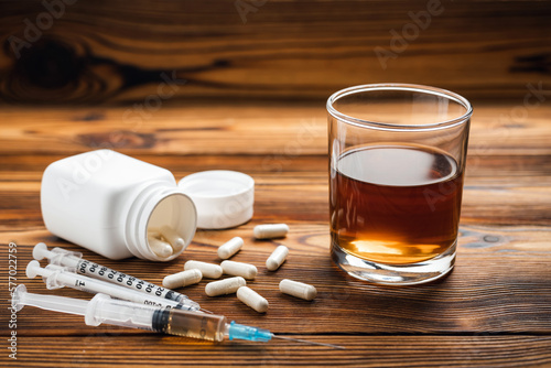 Glass with alcohol drink, whisky or brandy and drugs, white pills, syringe with a dose on a wooden table. Concept of addiction and bad habits