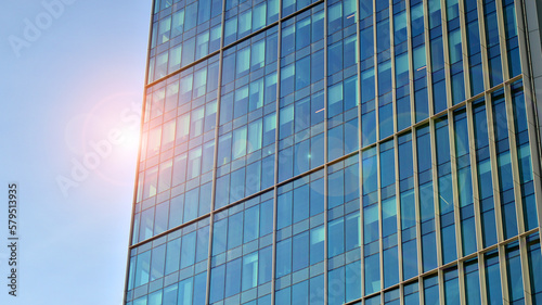 Looking up at the commercial buildings in downtown. Modern office building against blue sky. Windows of a modern glass building.