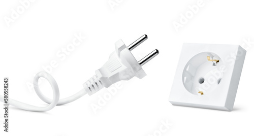 electric plug and socket on isolated white background, front view