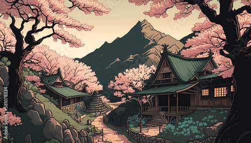 Japanese mountain village in a cherry tree forest. Graphic novel illustration style. Bubblegum pastel colour scheme. Black outline illustration. Curved corners