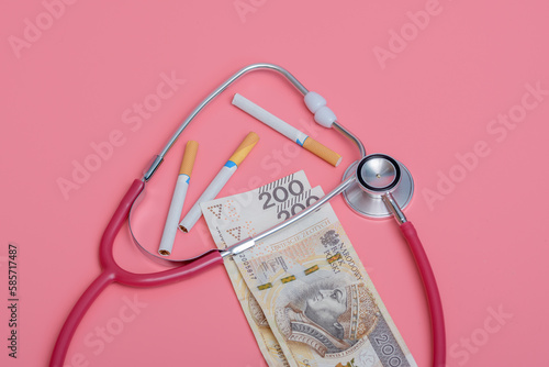 Papierosy leżące obok pieniędzy i stetoskopu
