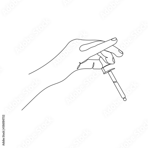 Hand holding glass pipette. One line art. Hand with a dropper take a drop of serum. Skin care concept. Hand drawn vector illustration.