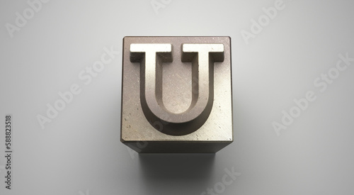 Letra metálica U de imprenta en alto relieve sobre fondo blanco.