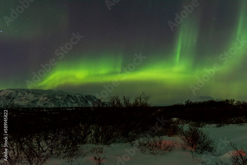 imagen nocturna de un paisaje nevado con una aurora boreal en el cielo nocturno de Islandia