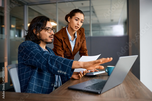 Young entrepreneurs cooperating while working on laptop in office.