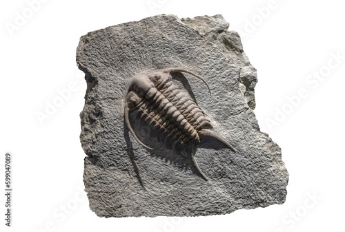 Fósil de amonita en piedra, aislado sobre blanco. Fósiles del Jurásico. Concepto de arqueología y paleontología.