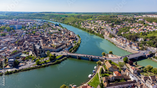 Aerial view of the confluence between the Seine and the Yonne showing different colors of water mixing in the town of Montereau Fault Yonne in Seine et Marne, France