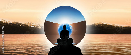Abstract background. leadership in spirituality and quiet meditation against river background. concept of conscious living. copy space, banner, website, poste - 3d rendering