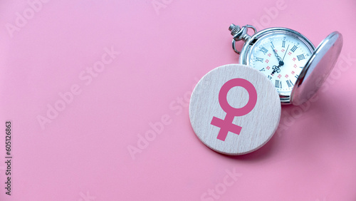 Menopause concept. Women symbol over a watch. Healthcare and medical for women. Pink background with copy space.