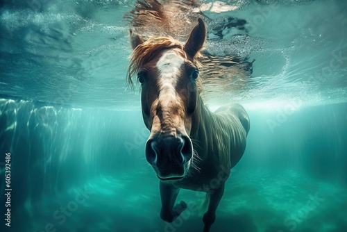 Majestic Chestnut Horse Swimming Underwater in a Clear Blue Pool with Light Rays Reflecting on the Surface
